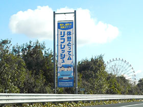 【左】刈谷PA入口手前、16.2kpst手前の垂れ幕と刈谷PAの観覧車。