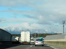 【左】みえ川越I.C付近から雲がかかった雪の鈴鹿山脈。(2022/12/27撮影)