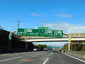 【左】四日市Jct.500mの案内板。(2019/12/27撮影)