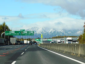 【右】四日市Jctの案内の奥にど〜んと雪の鈴鹿山脈!(2022/12/27撮影)