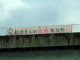 【下り】61.6kpstの奥の西山橋の横断幕「ようこそ 松田さんの故郷(ルーツ)松田町へ」。(2022/8/12撮影)