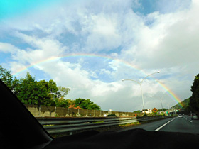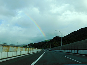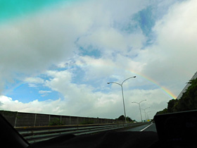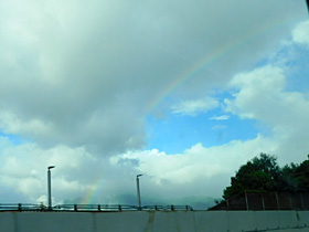 【下り】58.6kpstから松田山西平畑公園と虹。下の方が透けているのが不思議。(2022/8/12撮影)
