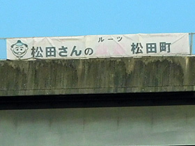 『ようこそ 松田さんの故郷(ルーツ)松田町へ』。(2024/8/9撮影)