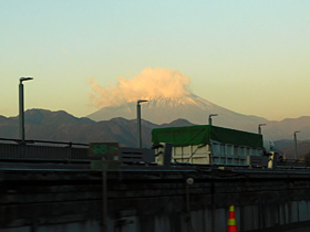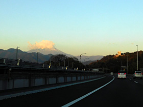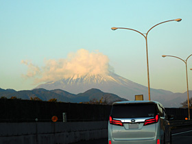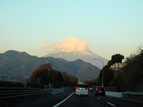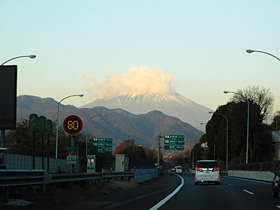 【左】59.2kpst(速度標識の手前)から正面に富士山♪頭にもくもくと雲(^^)(2024/12/27撮影)