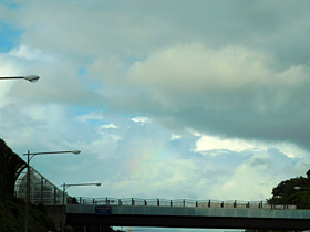 【下り】「秦野市」の看板奥の陸橋付近に虹が見えた(^^)(2022/8/12撮影)