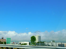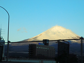 【左】御殿場I.Cを過ぎて。分厚い雲が横に広がって、富士山の頭だけが見えていた。
