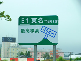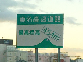 【下り】御殿場I.Cの出口と合流の間の「東名高速道路 最高標高454m」。 2018年の12月に比べると、表記の変更と「454m」が青い囲みになっていた(^^)(2019/8/9撮影)